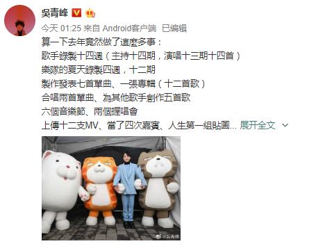 新年初始,吴青峰发文分享了2019年的年终总结,他回顾自己这一年参加了什么节目,录制了几个采访,发表了几首歌,开了几场演唱会,他表示自己日日排练十分忙碌,更称这是“一场人生浩劫”。吴青峰回忆自己的过往略显痛苦,“成长环境的家暴,当初摆明看你穷的亲戚,大学时的忧郁症,攻击人身特质的网路言语,走到哪都是瞧不起你或自命清高的人,表面大气暗中整你压你的前辈,十年前也曾因为家人师长被个别媒体欺负而想退出,我以为走过这些,从来不贪不求不招惹的我,也算有点训练,不会再起绝念,我没想到我还能有更崩溃的时刻。”