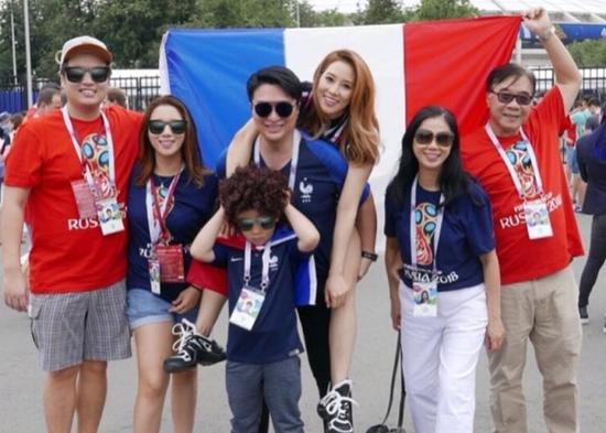 近日,“千亿媳妇”徐子淇晒出了和丈夫李家诚、三儿子李俊熹、爸爸妈妈和妹妹去到俄罗斯现场观看世界杯的照片。照片中他们举起法国国旗表示强烈支持,李家诚还直接背起了妻子徐子淇,而三儿子Triston则戴上假发,非常可爱!