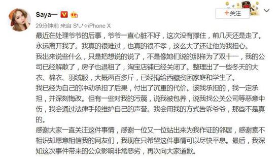 10月22日,网红saya发文称最近在处理爷爷的后事,证实此前网传爷爷因网络暴力而去世的消息。她还称自己出来澄清不是为了炒作,公司已经解散,店铺已关闭。而针对自己“被包养”、找公关公司“洗白”等恶意中伤,她表示将通过法律手段维权,并且再次向公众表示了歉意。